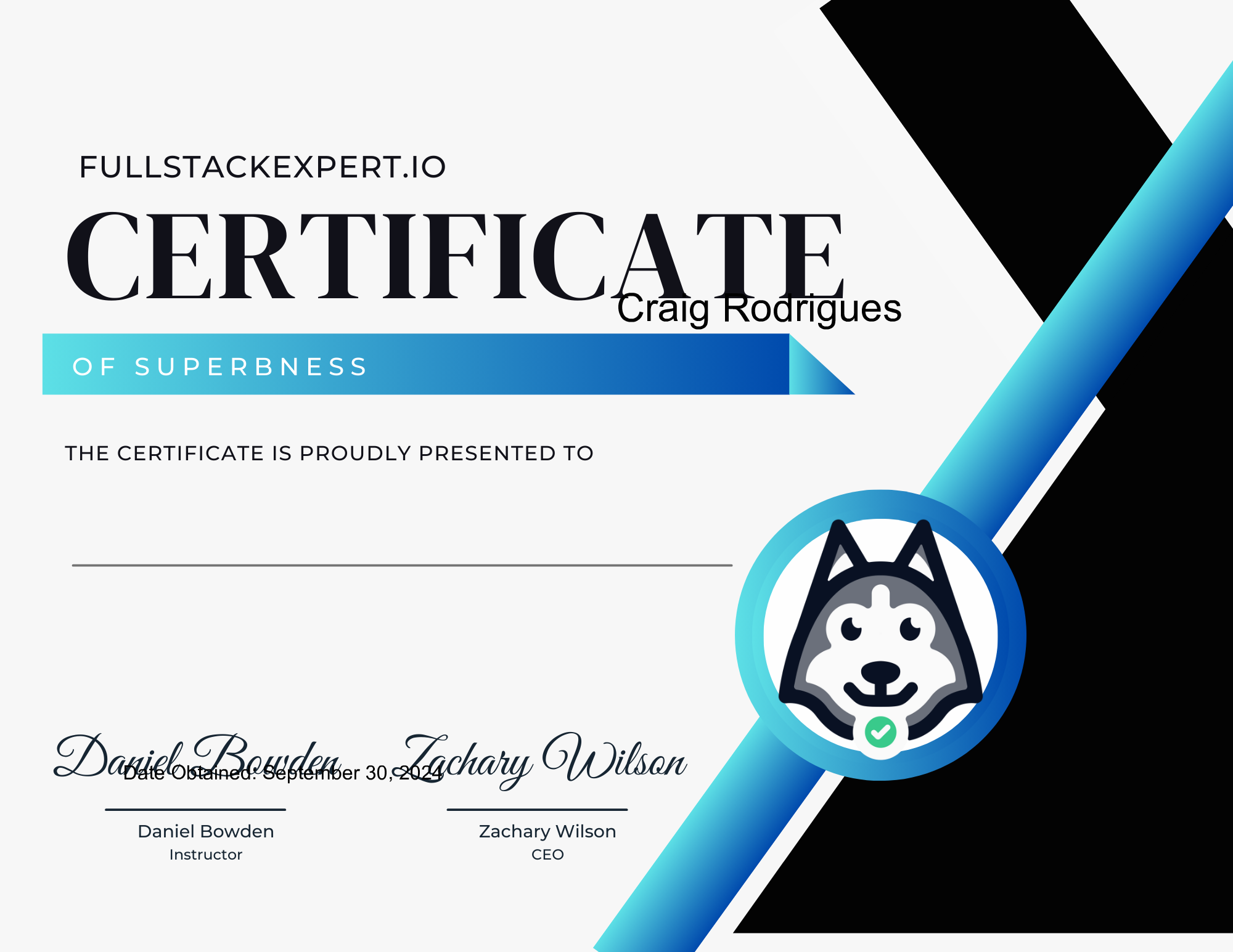 FullStackExpert.io Superb Certificate - Craig Rodrigues